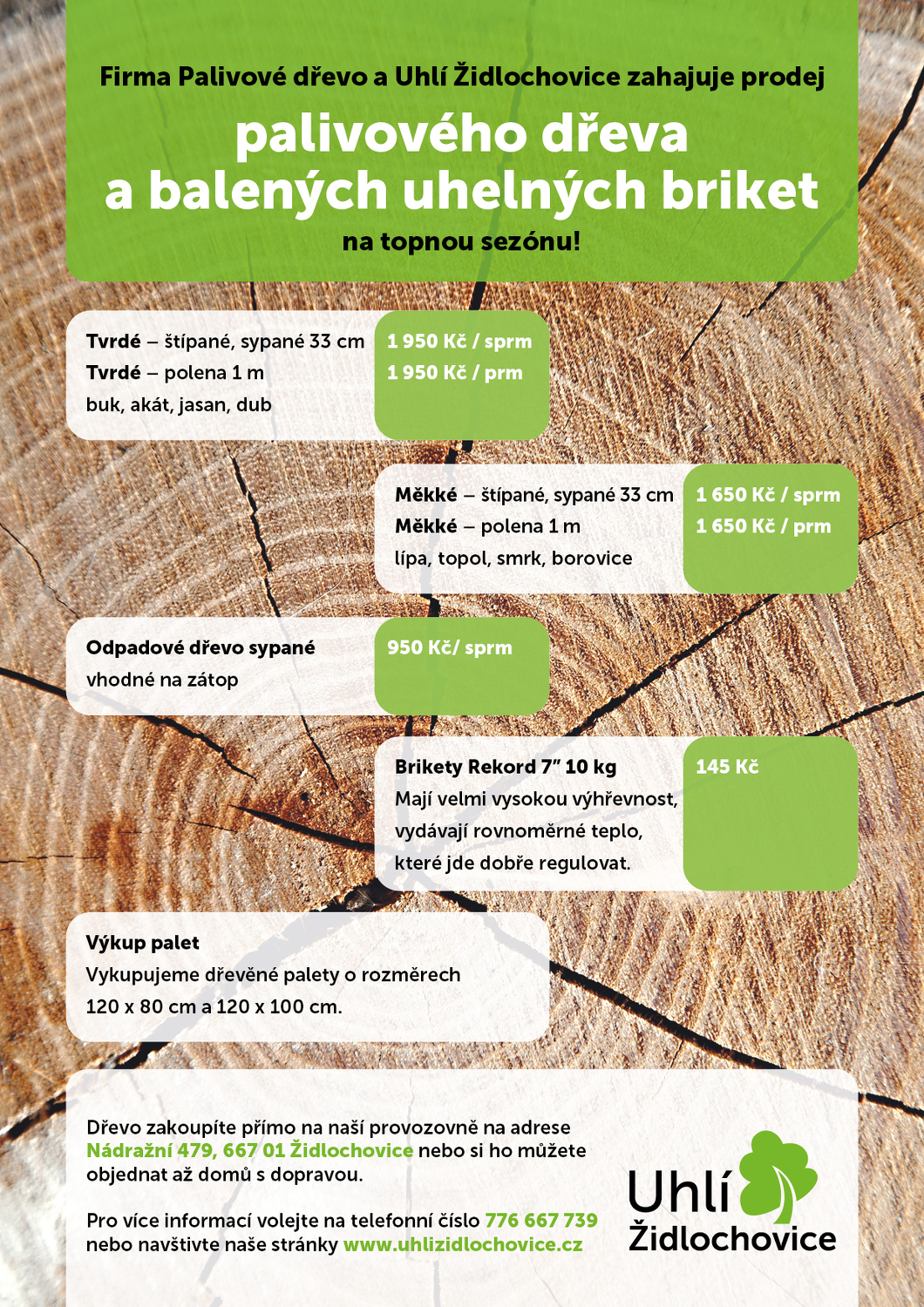 Firma Palivové dřevo a uhlí Židlochovice zahajuje prodej palivového dřeva a balených uhelných briket na topnou sezónu! V nabídce je tvrdé i měkké dřevo, naštípané i v metrových délkách. Dřevo zakoupíte přímo na adrese Nádražní 479, Židlochovice. Nebo si ho můžete objednat až domů s dopravou. Pro více informací volejte na telefonní číslo 776 667 739 nebo navštivte naše stránky www.uhlizidlochovice.cz