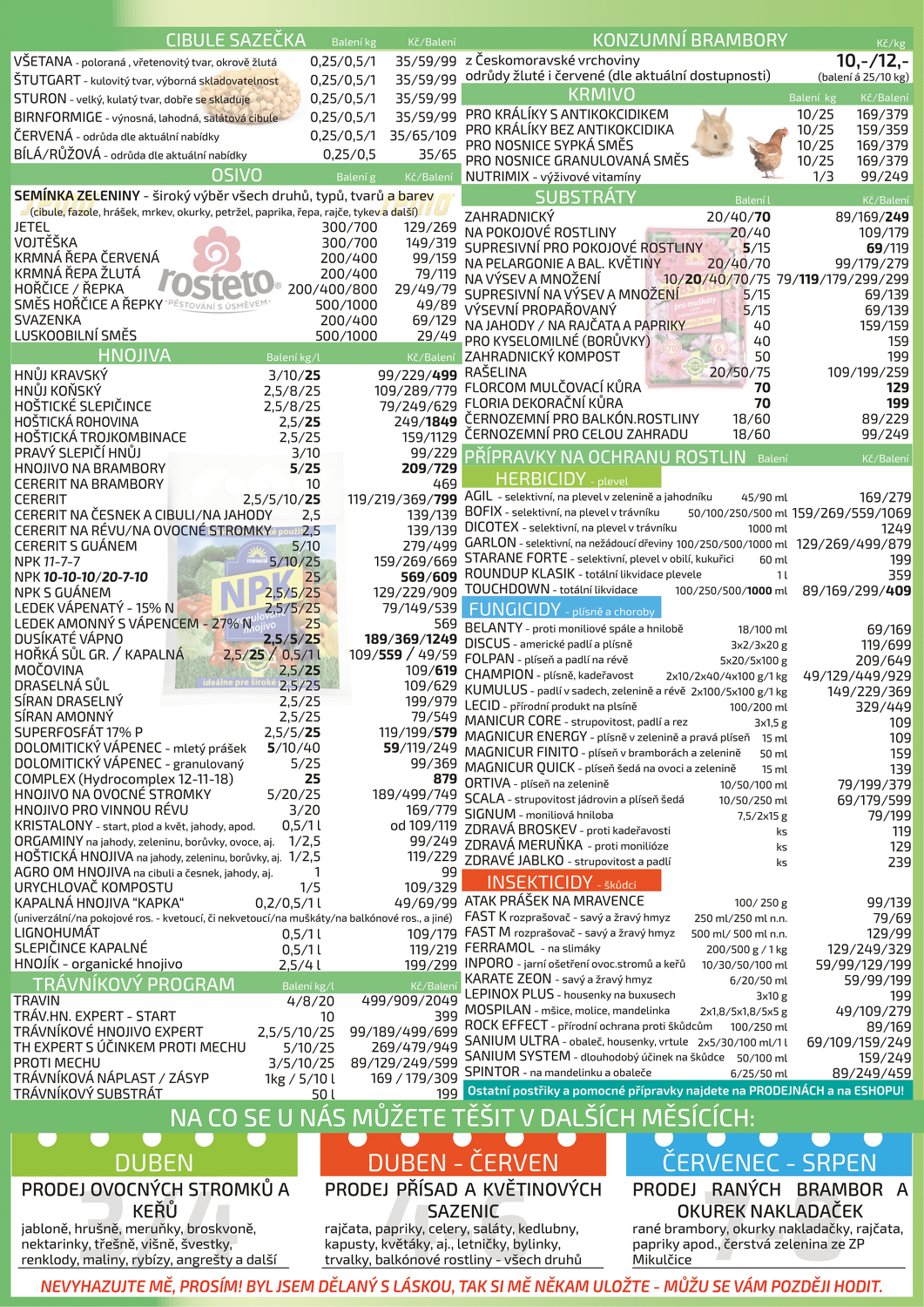 V nabídce naleznete také zeleninová semínka, cibuli sazečku, postřiky a mnoho dalšího - vše za výhodné ceny.
