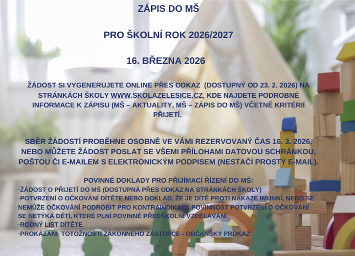 Informace k zápisu do mateřské školy pro školní rok 2026/2027.